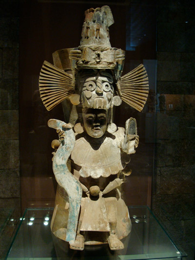 | Fig. 6 : Un prêtre ayant revêtu les atours du dieu Tlaloc (encensoir en céramique conservé au Museo Nacional de Antropología, Mexico – photo : Sylvie Peperstraete). |