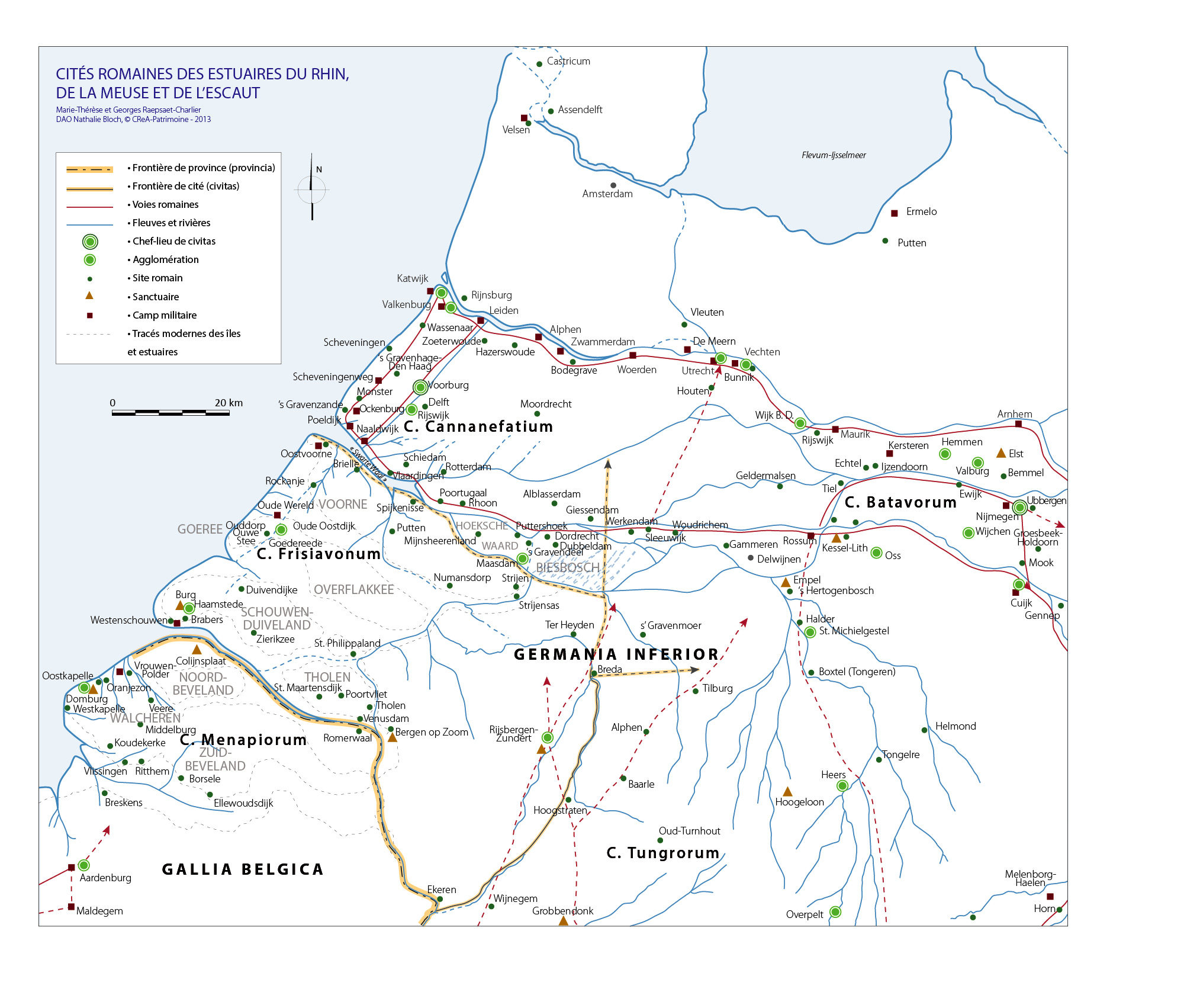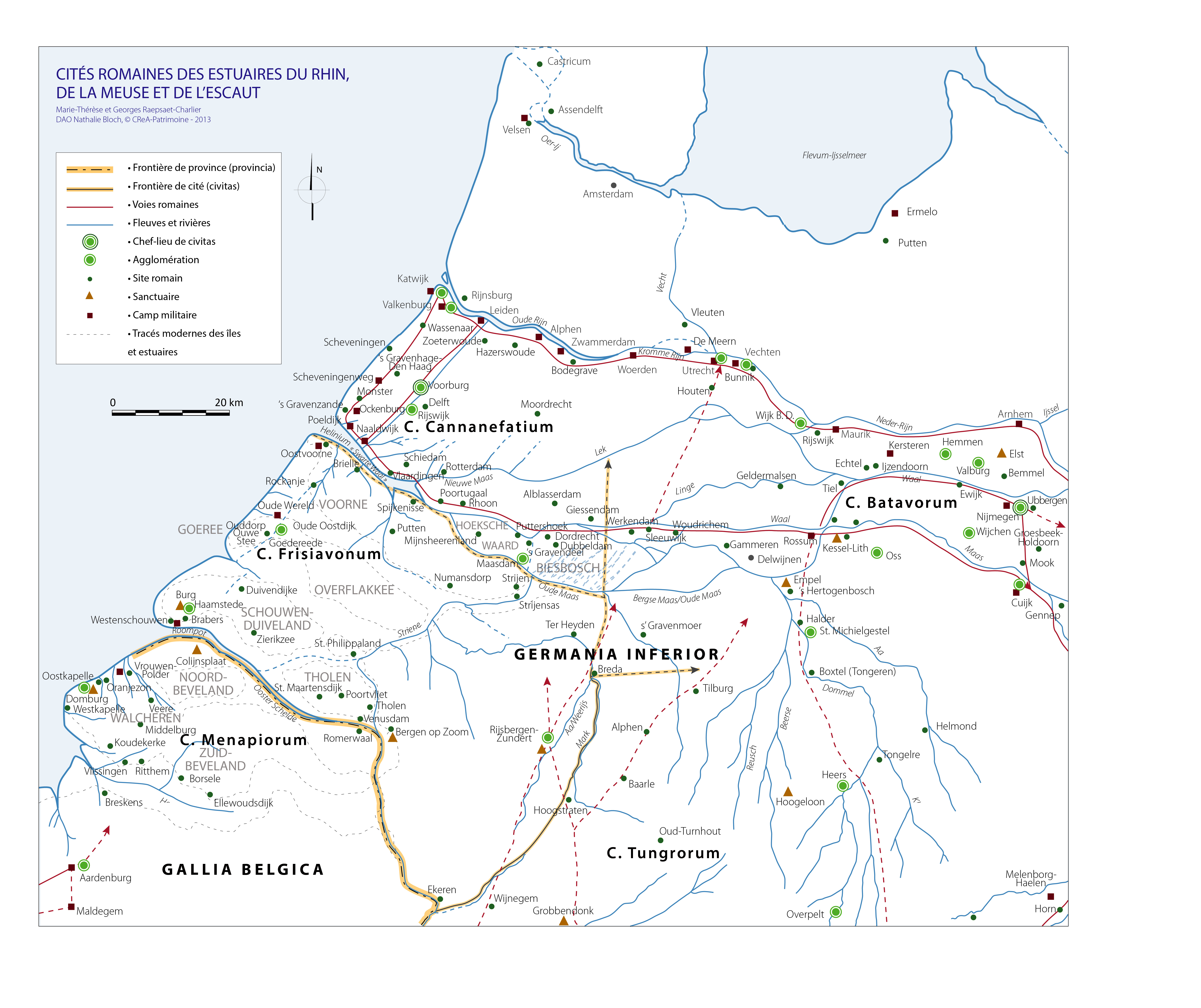 En dernier lieu, une carte spécifique de la région des embouchures (carte III) a été dessinée à l’occasion d’une étude approfondie sur la genèse des cités romaines de Zélande. Cette recherche a confirmé l’appartenance à la Belgica des actuelles îles méridionales qui, à l’époque, étaient attachées au continent et largement émergées. De ce fait les grands sanctuaires de Domburg et de Colijnsplaat ne relèvent pas de la Germanie inférieure comme on le croit communément mais bien de la cité des Ménapiens. Les sites néerlandais les plus récemment investigués ont été intégrés à la matière et une nouvelle proposition de répartition des territoires entre les Bataves, Cananéfates et Frisiavons de Germanie inférieure a été dressée, qui est destinée à corriger les tracés des cartes I et II. On trouvera dans l’article cité ci-dessous le détail des argumentations et hypothèses.