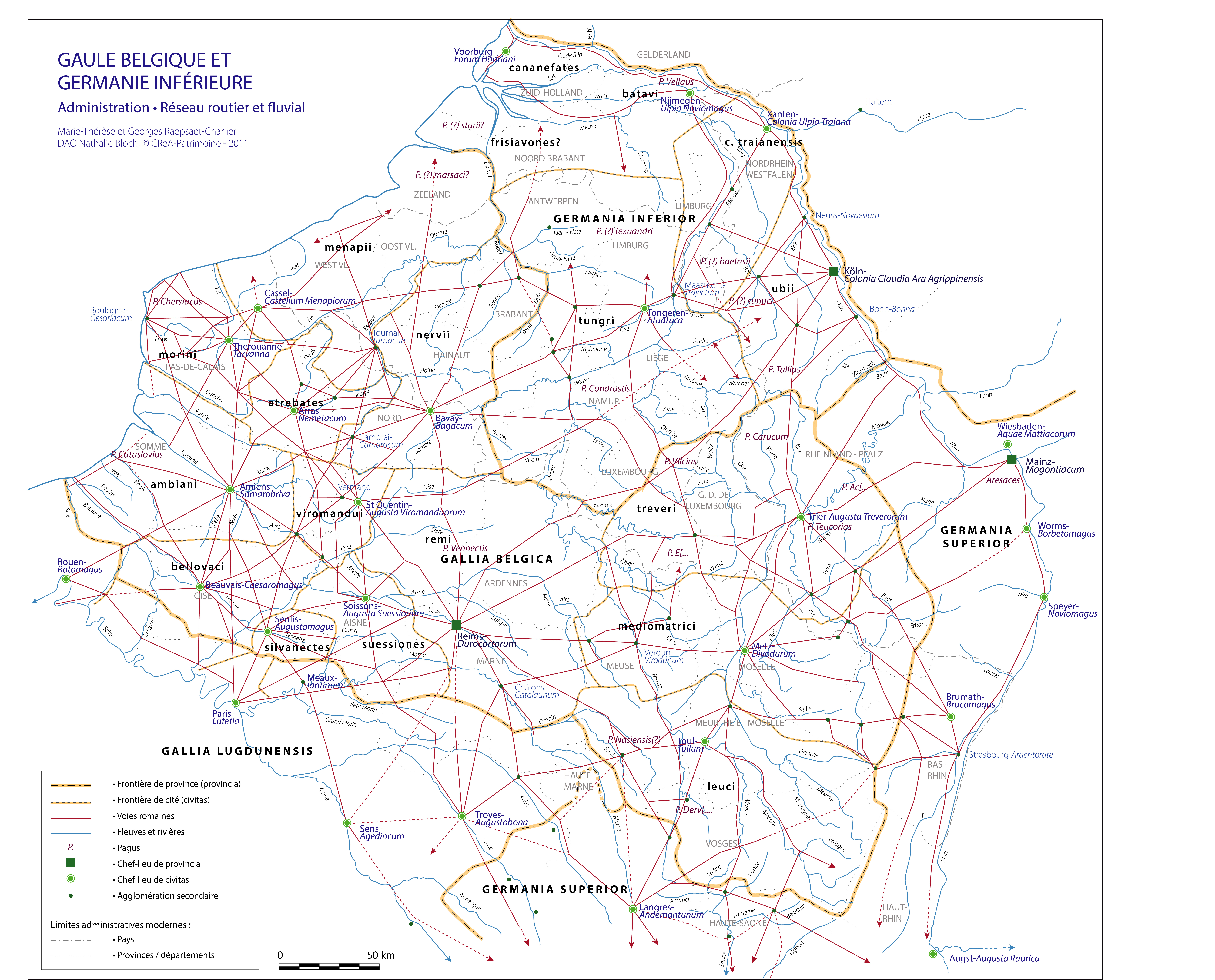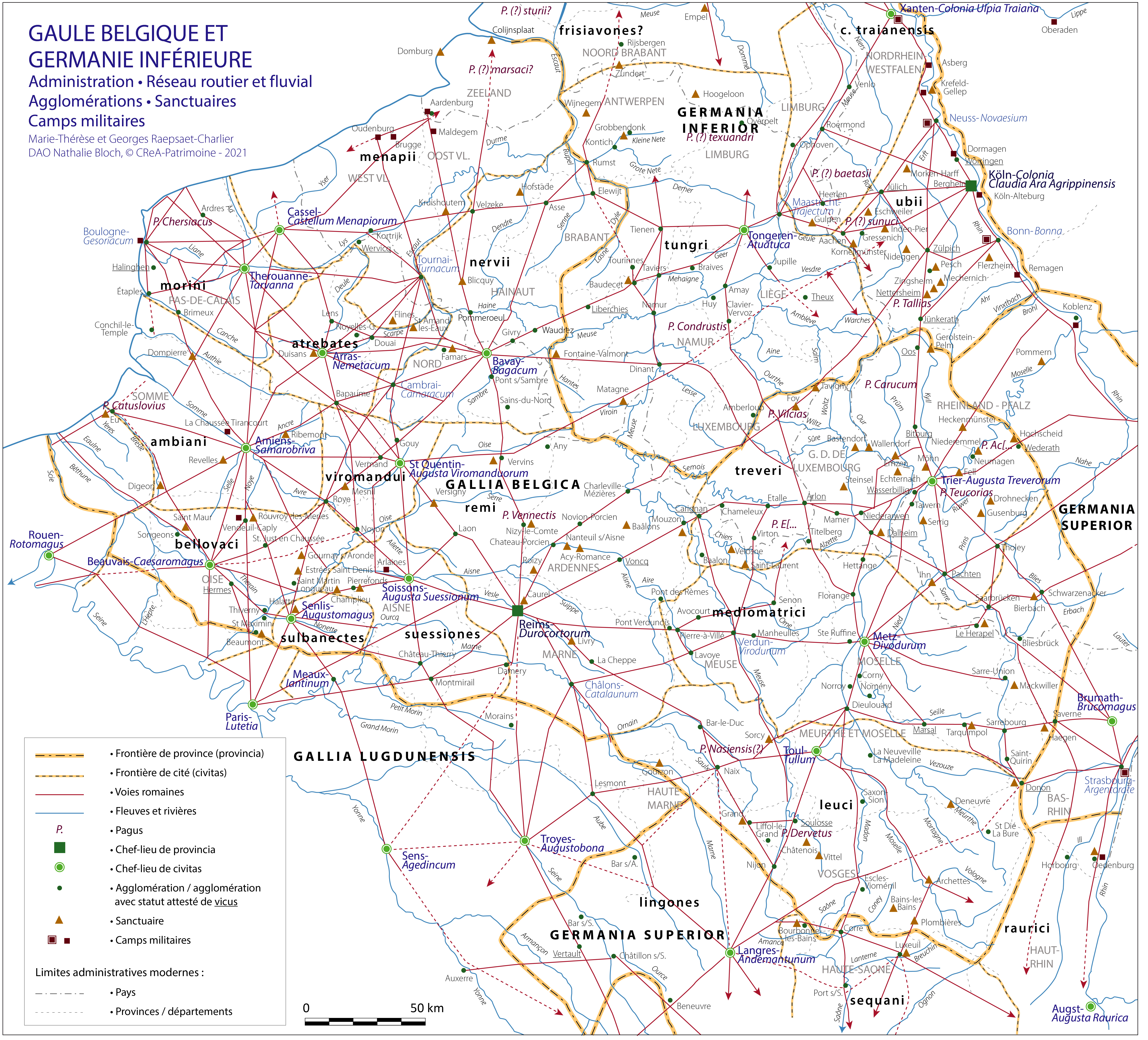 En 1974, Marie-Thérèse et Georges Raepsaet-Charlier publiaient dans le volume II, 4 d’Aufstieg und Niedergang der Römischen Welt (Berlin, De Gruyter) la carte historique et archéologique de la Gaule du Nord (Gaule Belgique et Germanie Inférieure). Ce travail demandait une sérieuse actualisation. Non seulement l’archéologie de terrain a engrangé d’innombrables découvertes importantes, mais l’histoire administrative, institutionnelle et cultuelle a énormément progressé. Cette mise à jour a été réalisée par les auteurs.